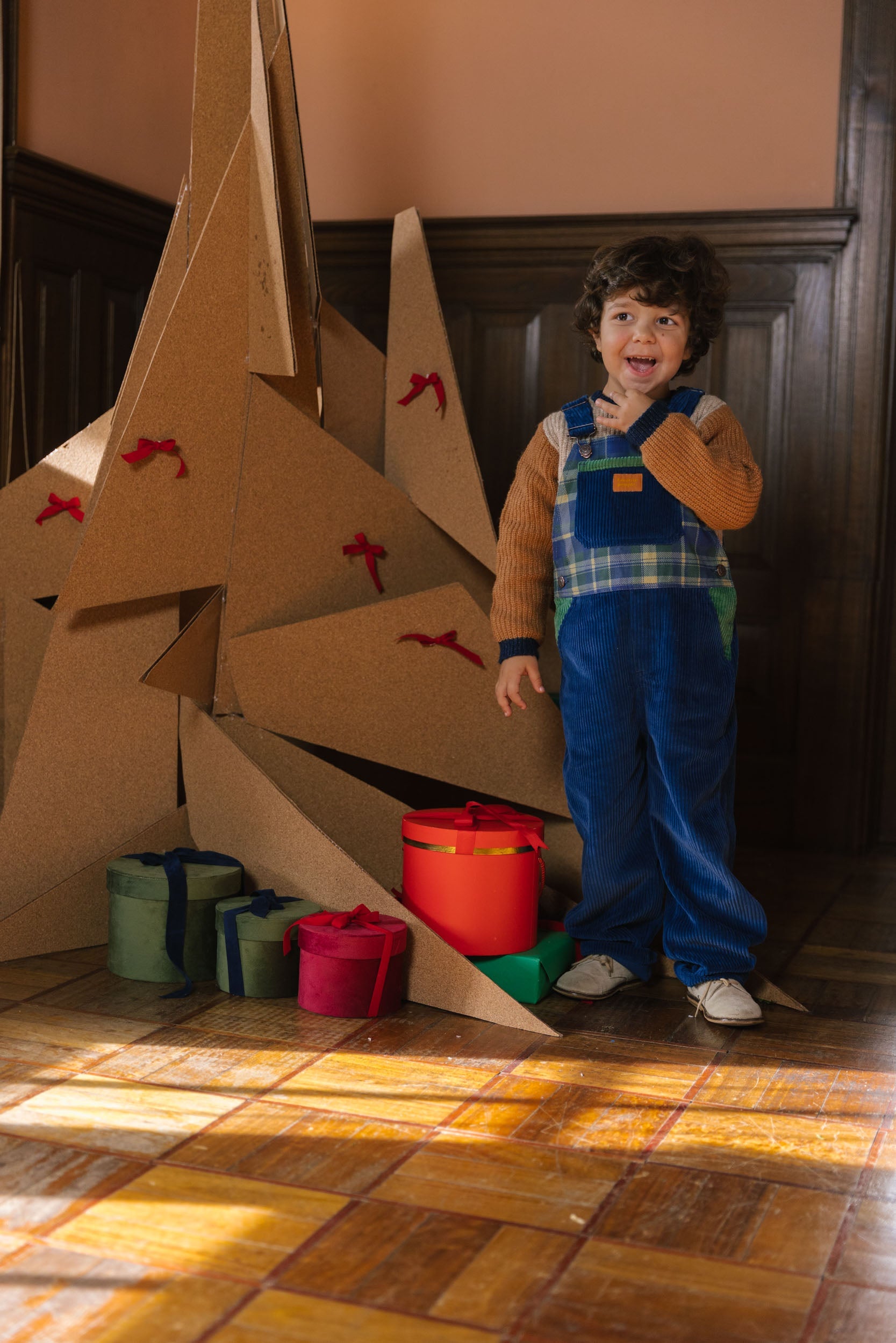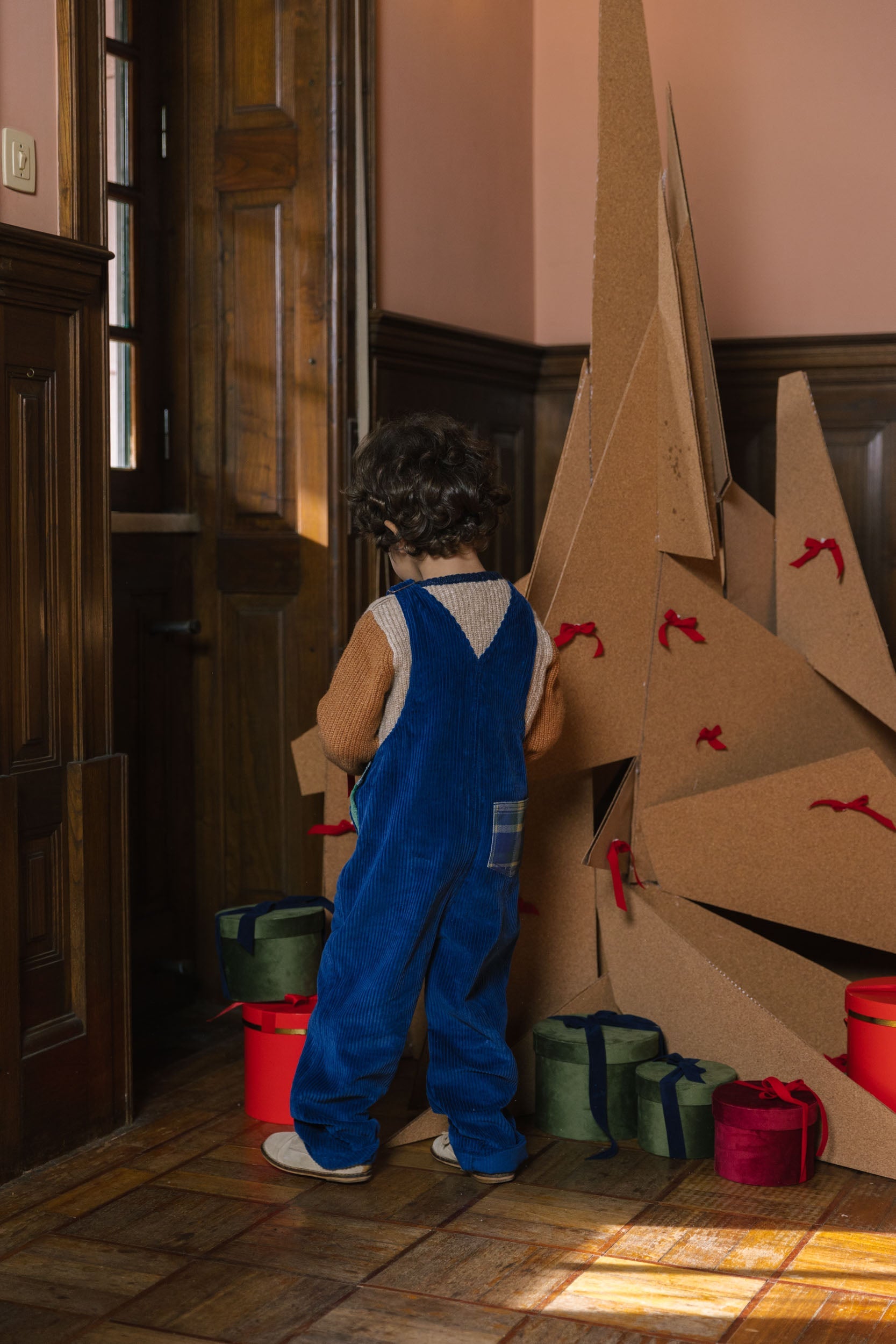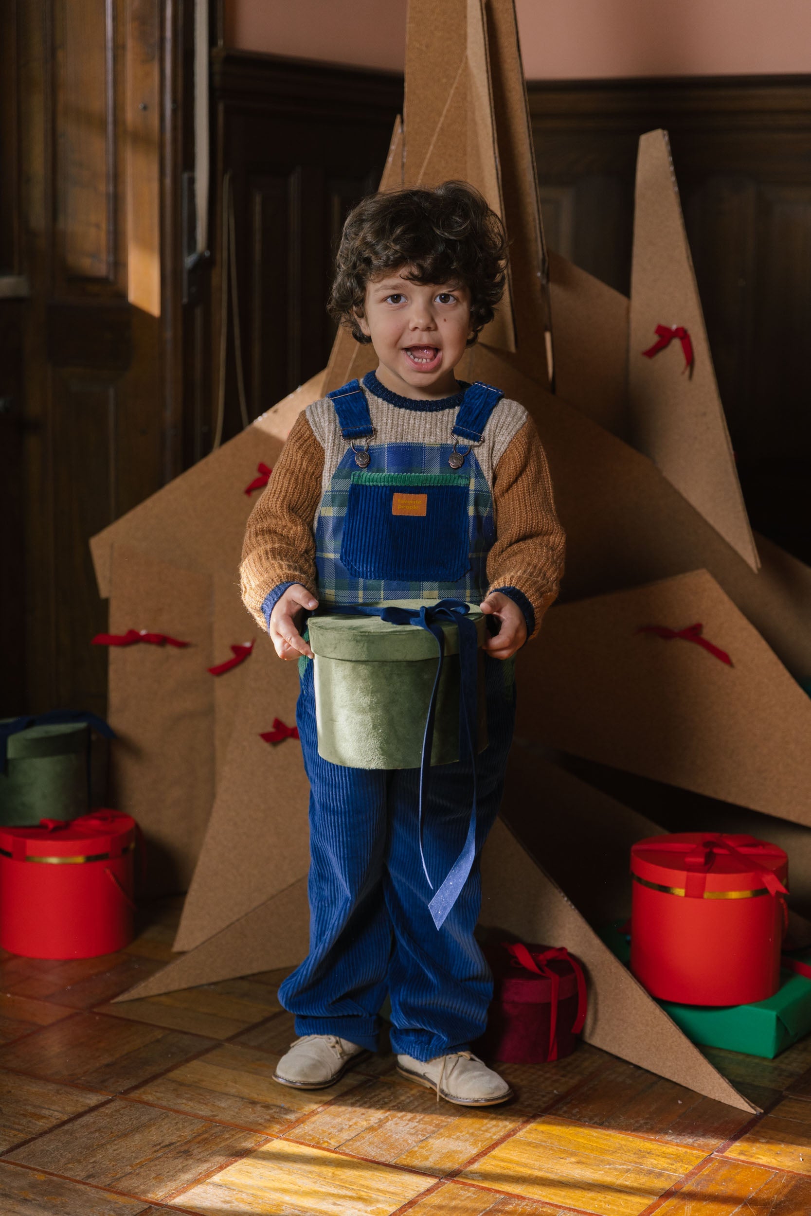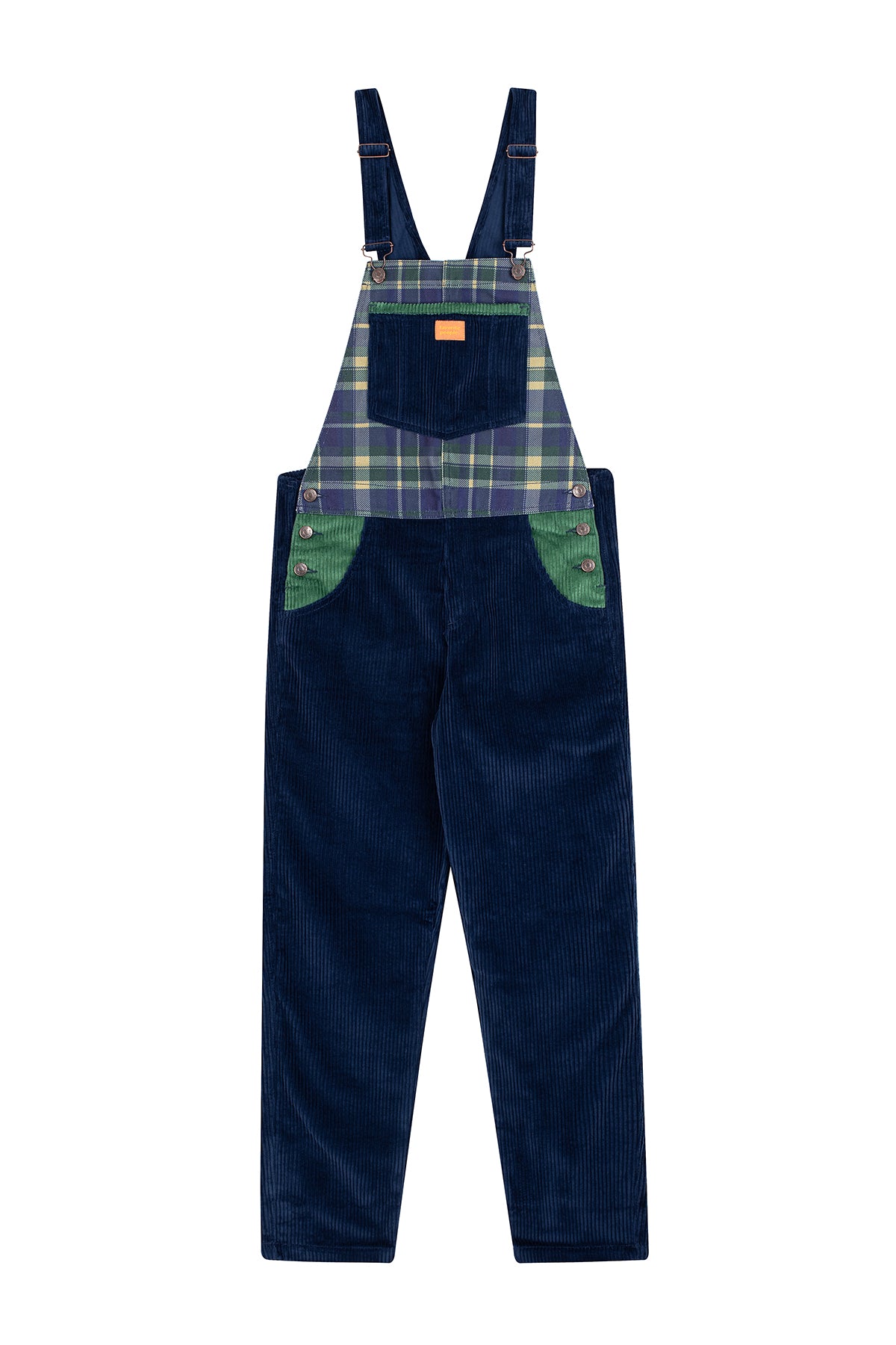 Jardineiras de criança e alças ajustáveis com fecho jardineira. Bolsos combinados à frente, estilo canguru no peito e bolso de aplicação nas costas.