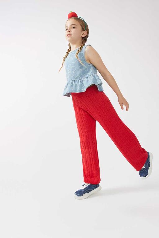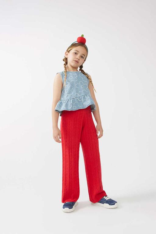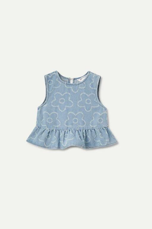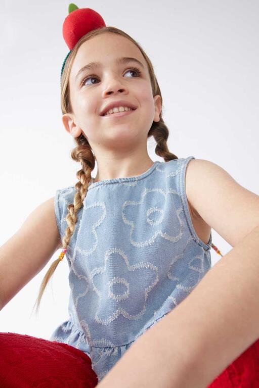 Top de menina em tecido jeans com flores bordadas. Com gola redonda e sem mangas. Detalhe de babado na barra.