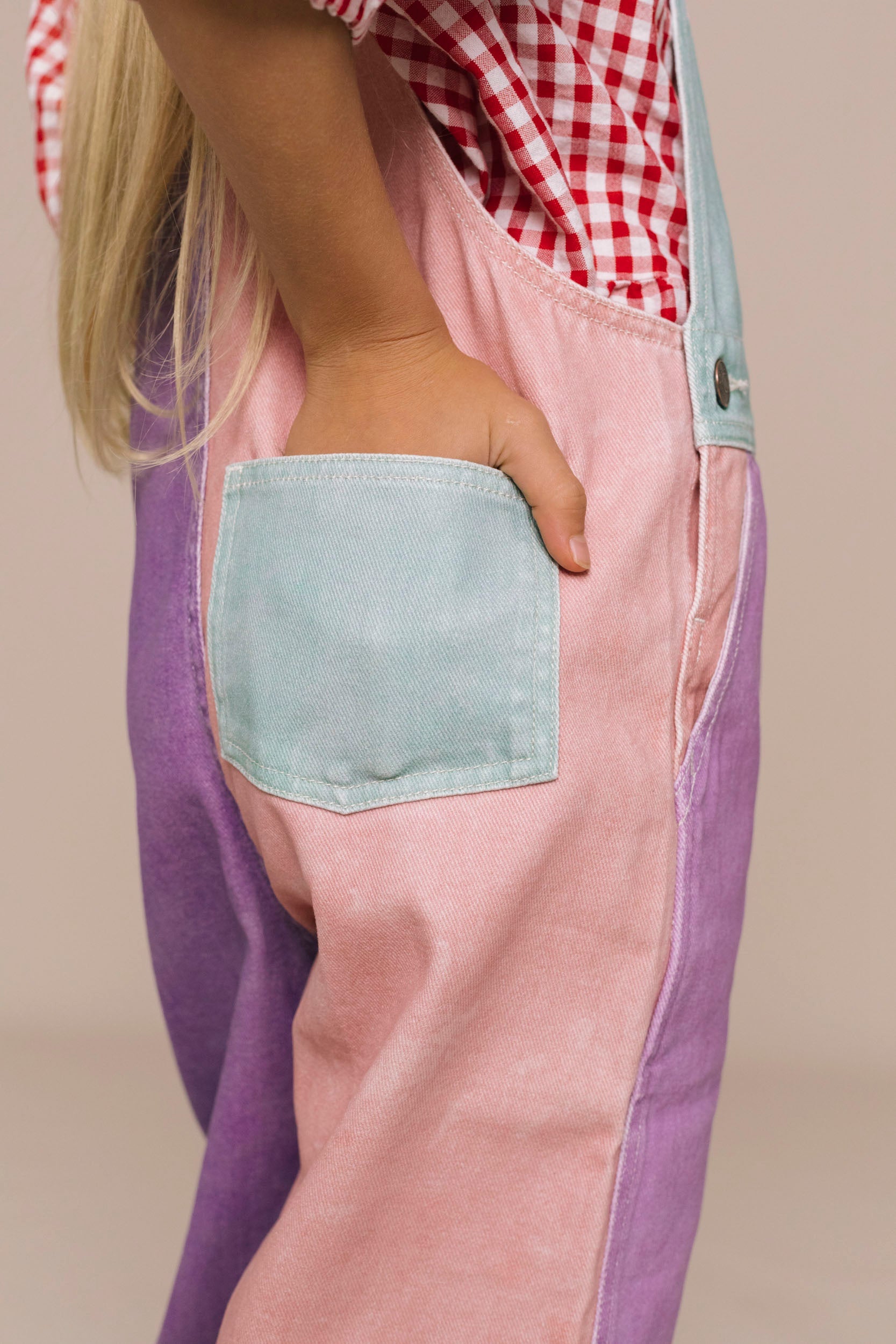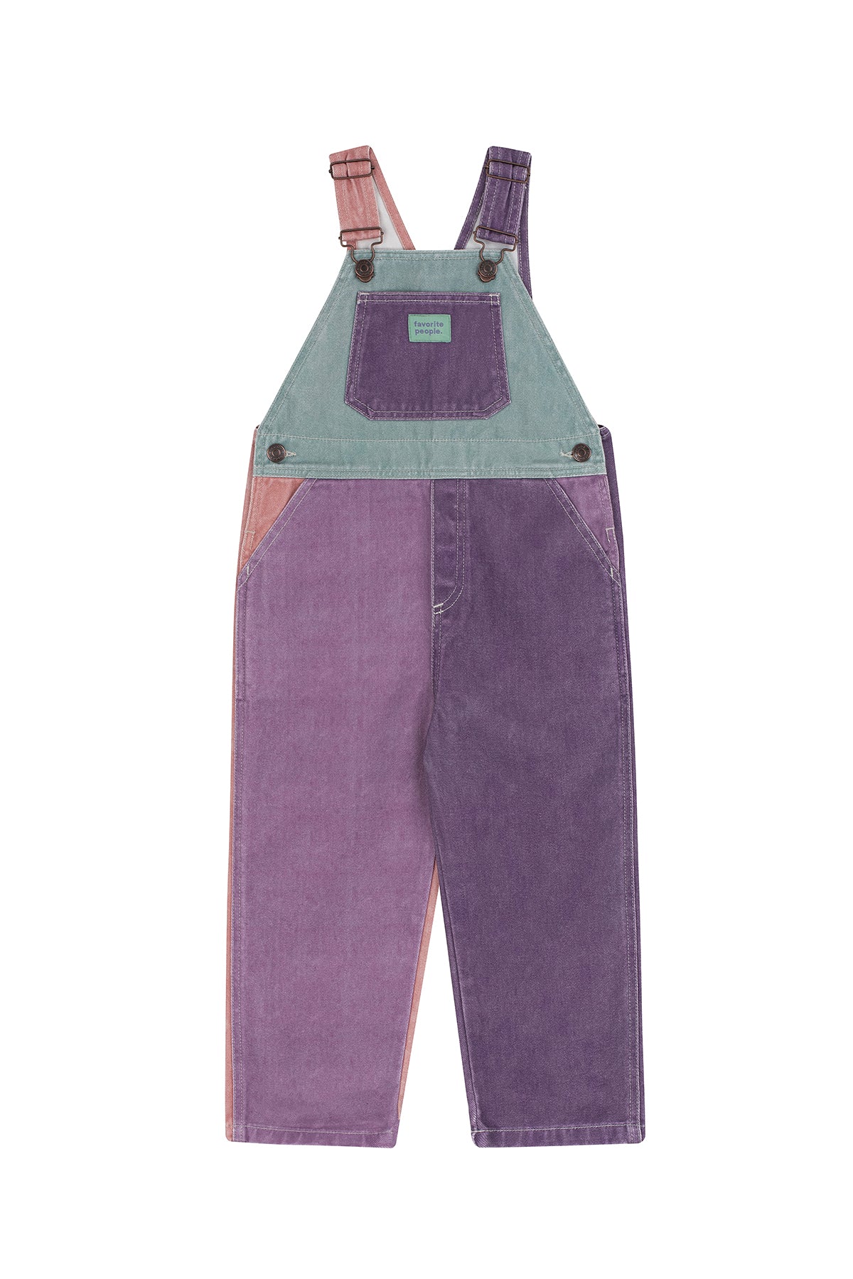 Jardineiras de criança e alças ajustáveis com fecho jardineira. Bolsos combinados à frente, estilo canguru no peito e bolso de aplicação nas costas.