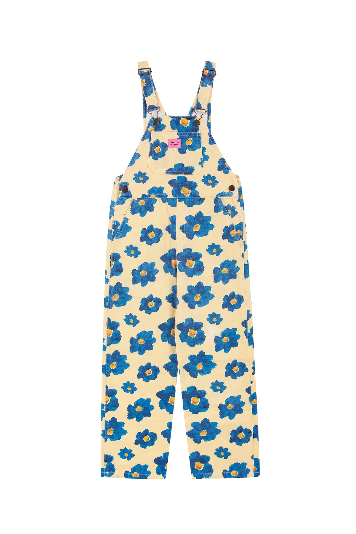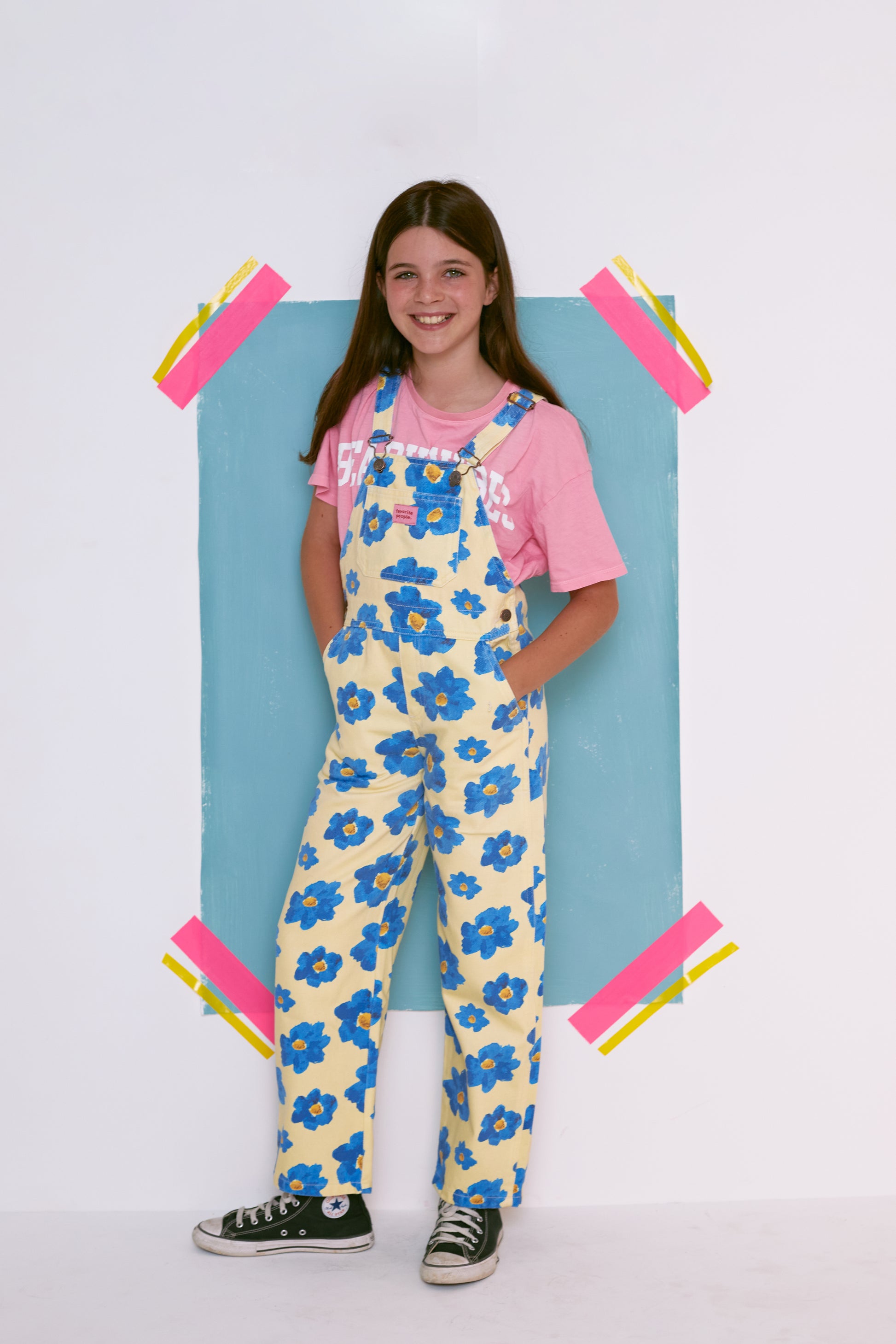 Jardineiras de criança amarelas com flores azuis, decote direito e alças ajustáveis com fecho jardineira. Bolsos combinados à frente, estilo canguru no peito e bolso de aplicação nas costas.