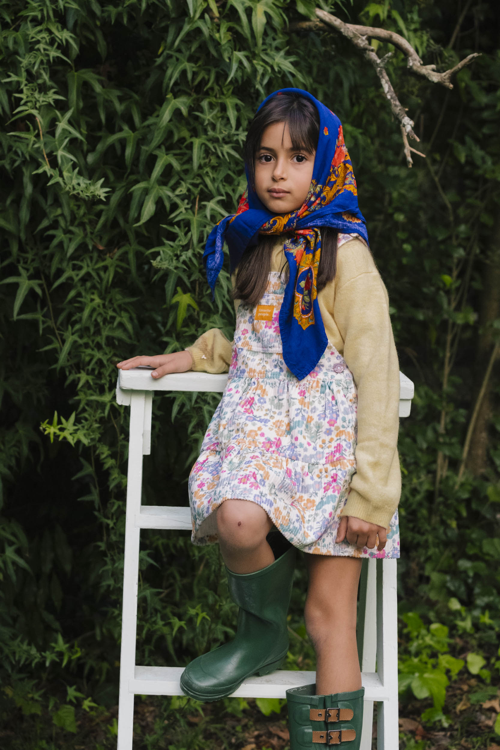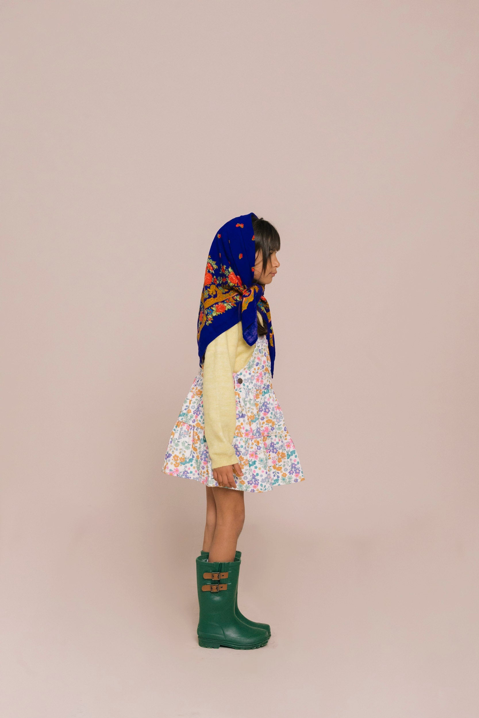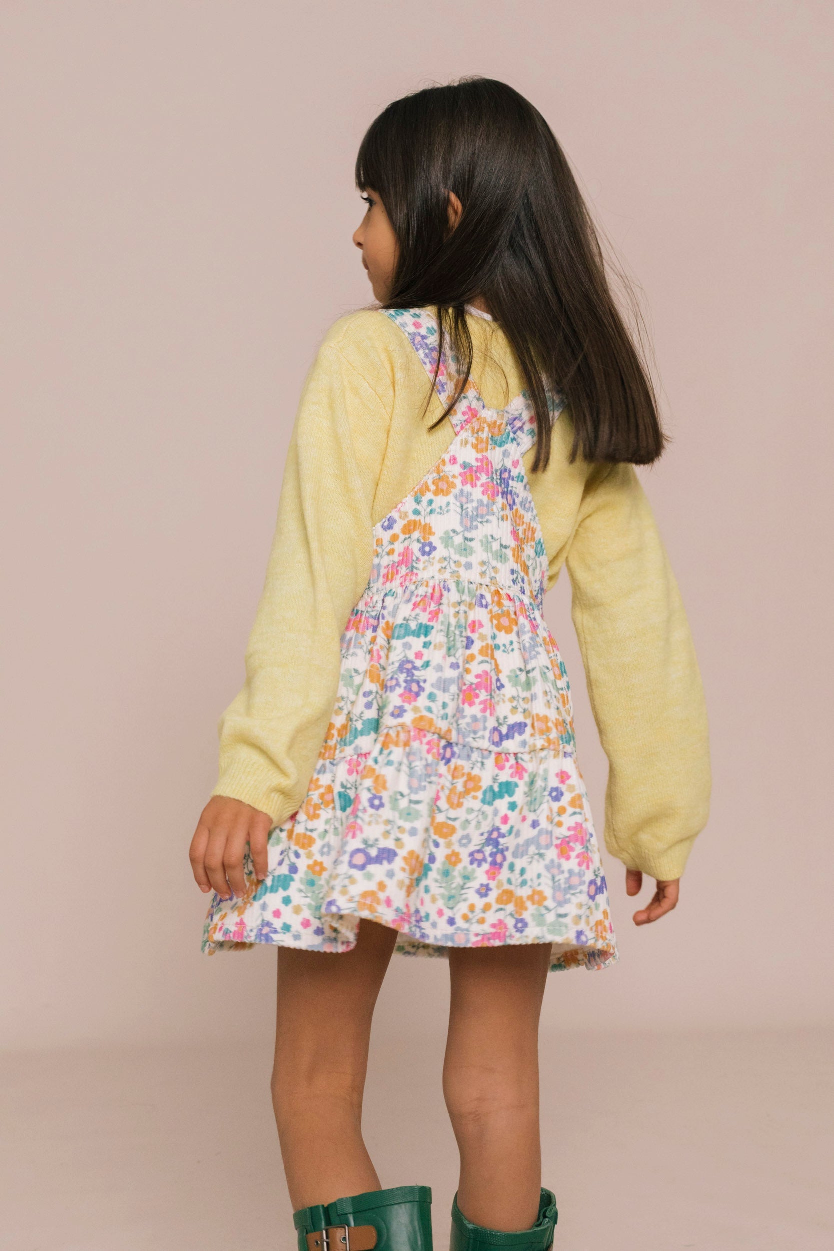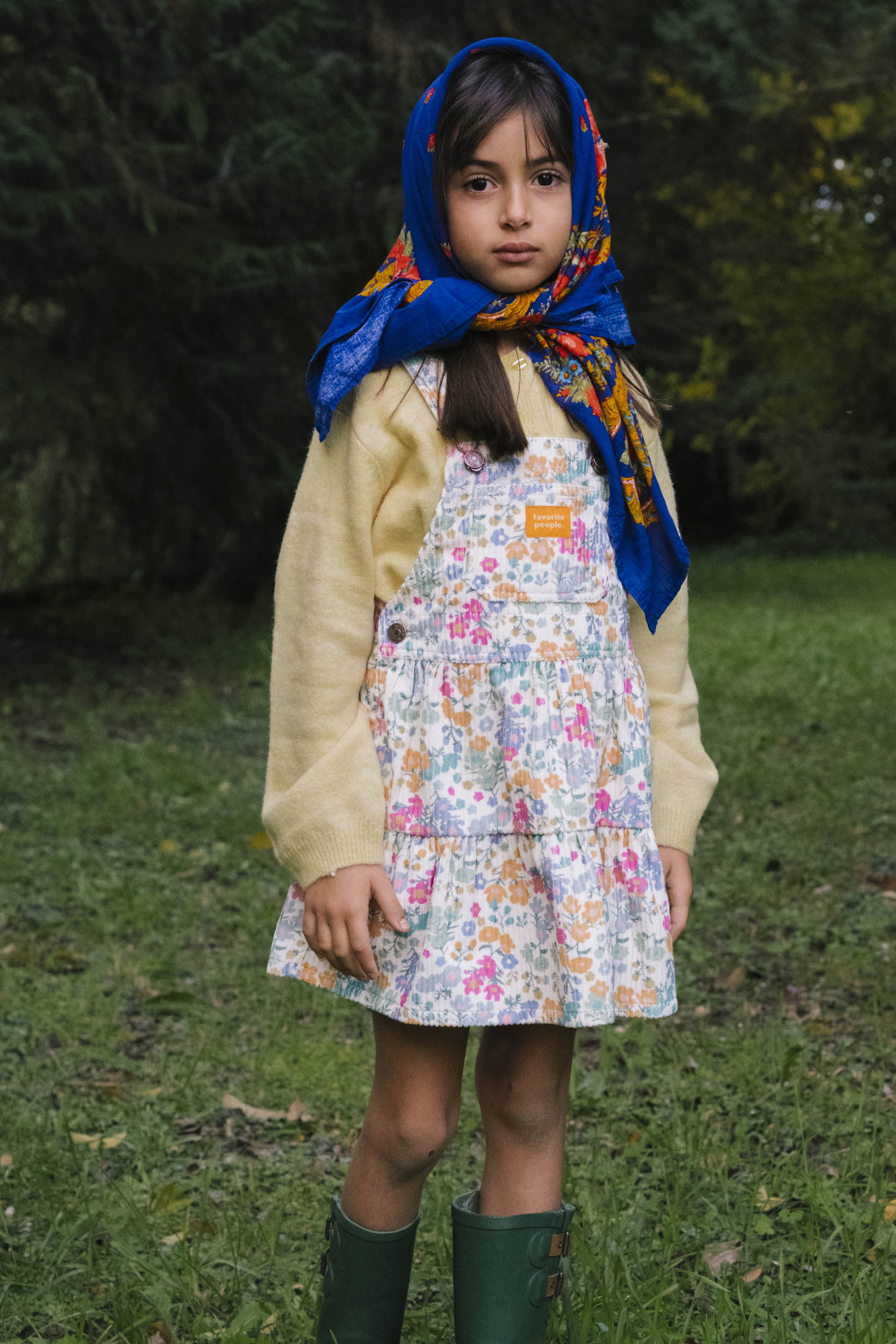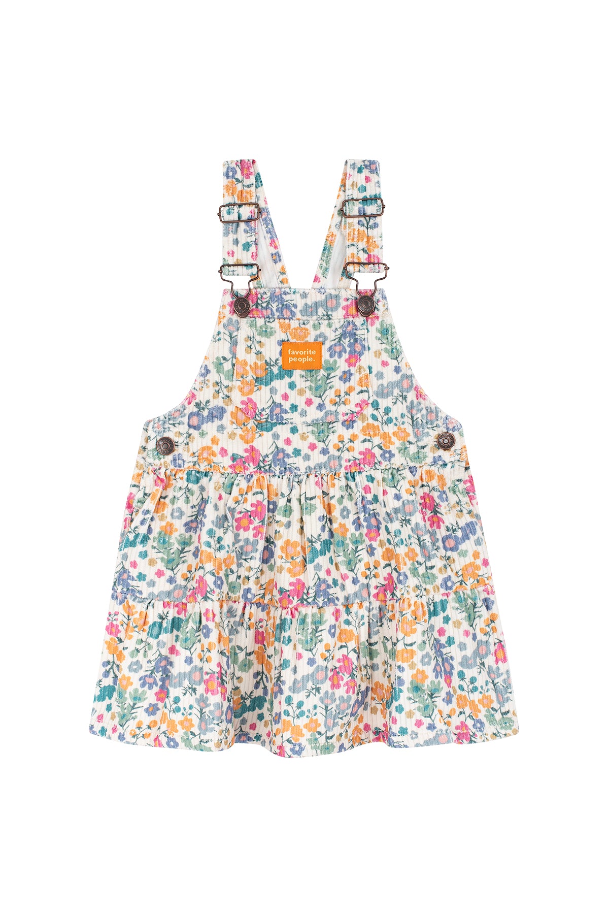 Jardineiras saia de criança, decote direito e alças ajustáveis com fecho jardineira. Bolsos combinados à frente, estilo canguru no peito e bolso de aplicação nas costas.