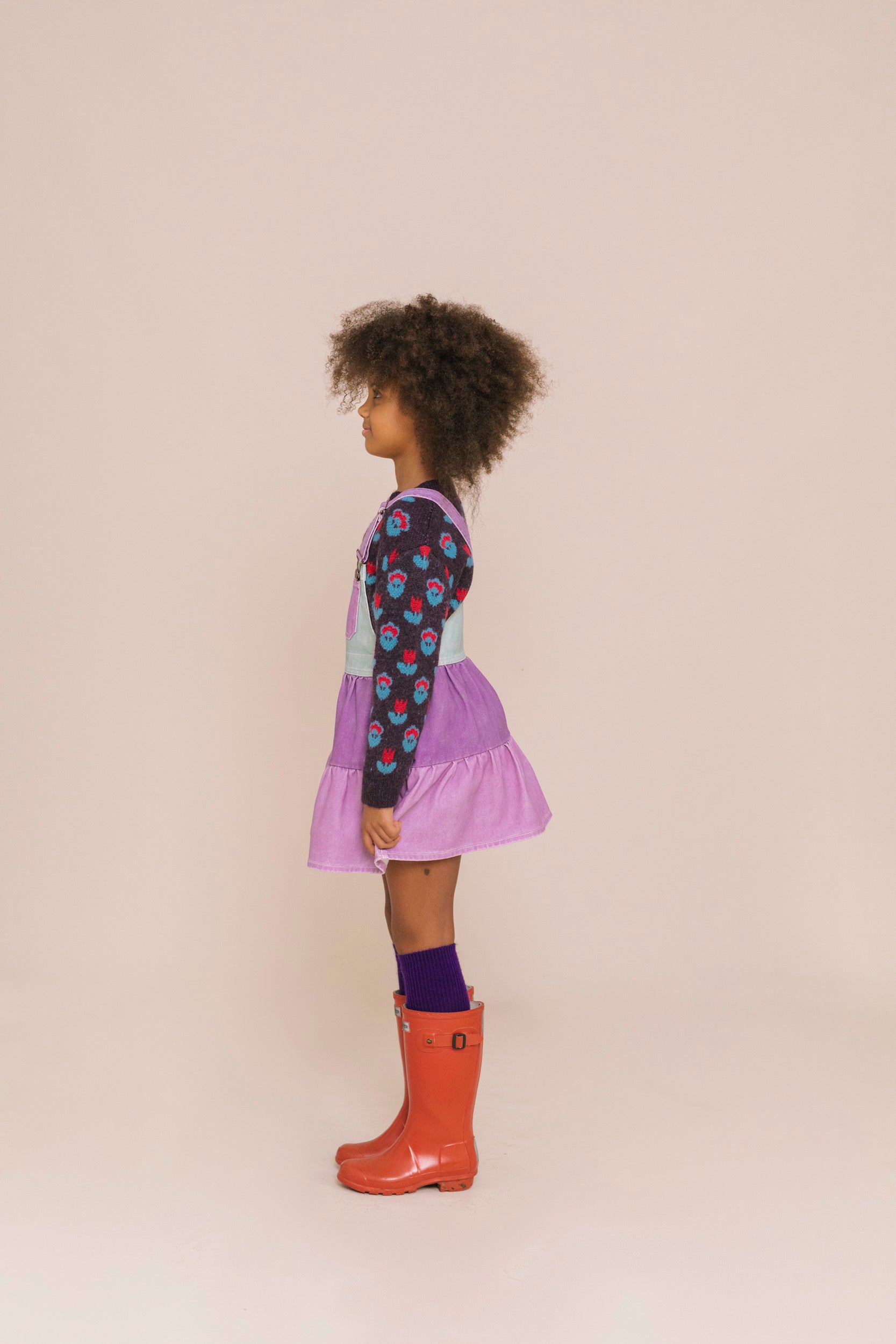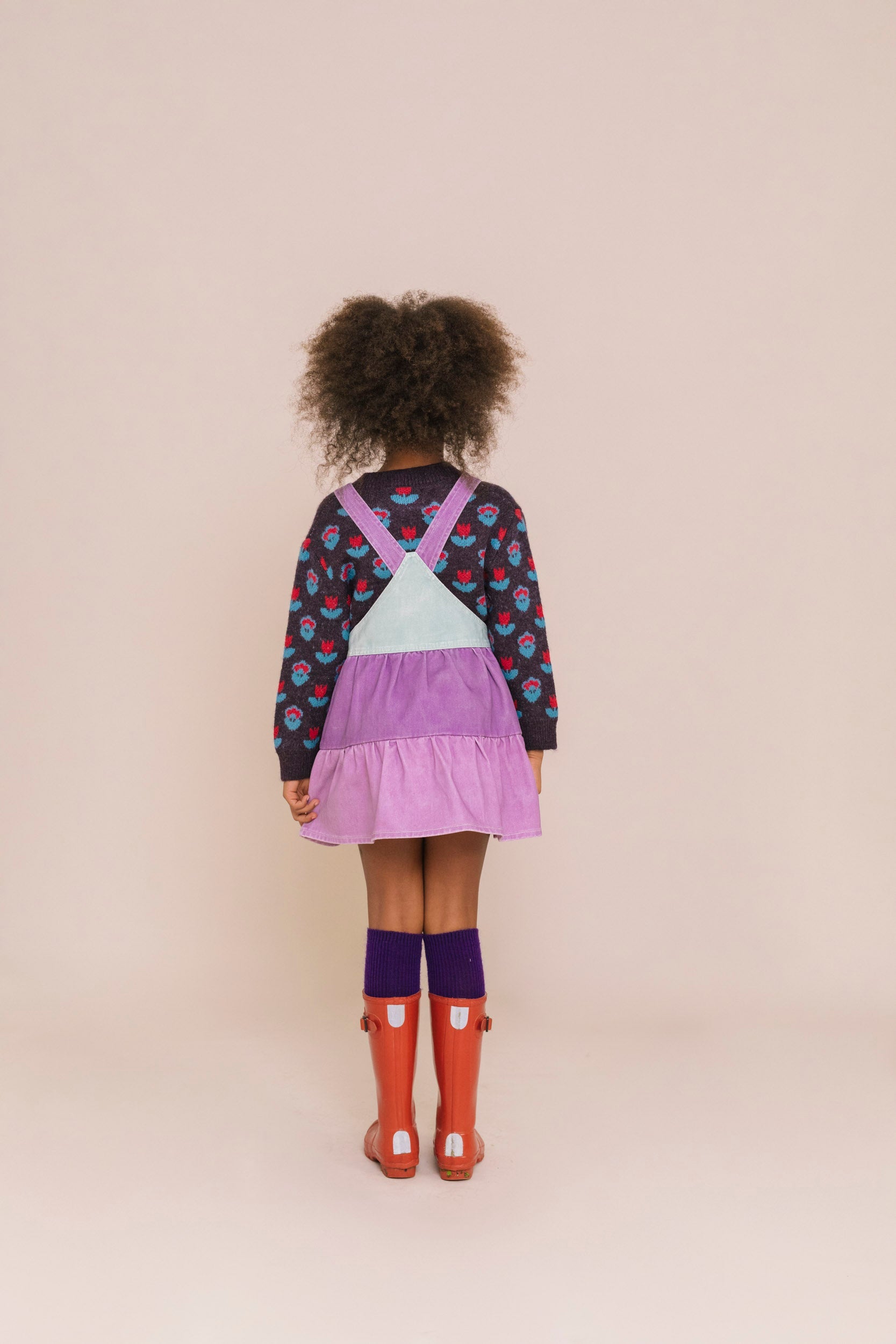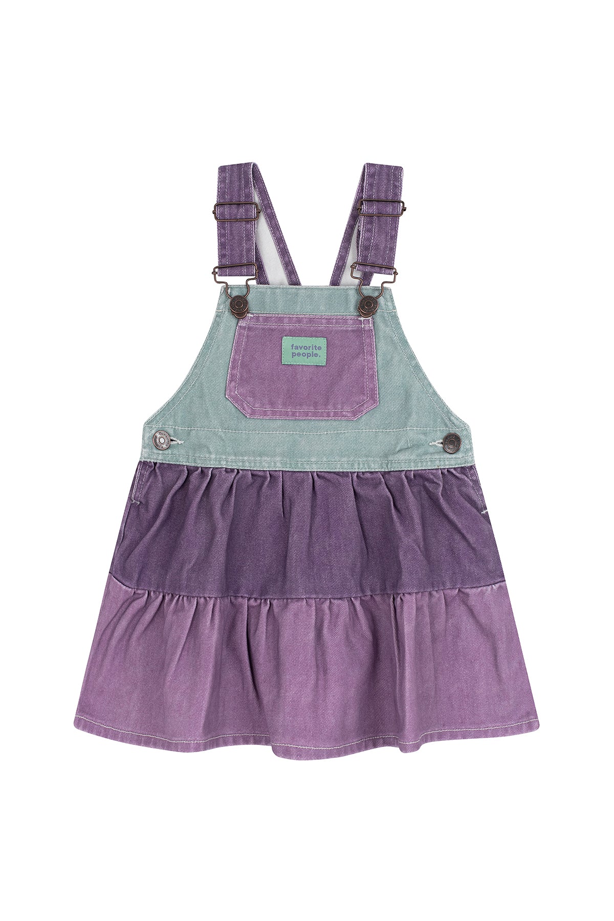 Jardineiras saia de criança, decote direito e alças ajustáveis com fecho jardineira. Bolsos combinados à frente, estilo canguru no peito e bolso de aplicação nas costas.